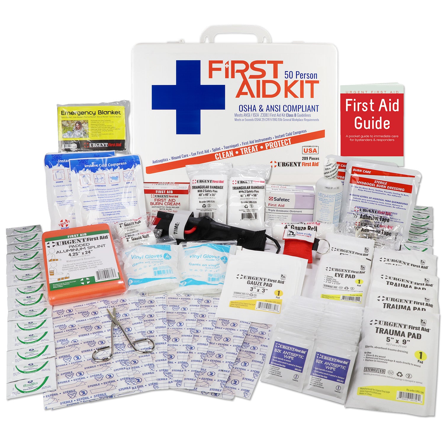 Urgent First Aid Kit, 209 Pieces, ANSI Class B, 25 to 50 Person in a lightweight, yet durable gasketed plastic case that is both portable and wall mountable. Meets ANSI case types I, II, III.