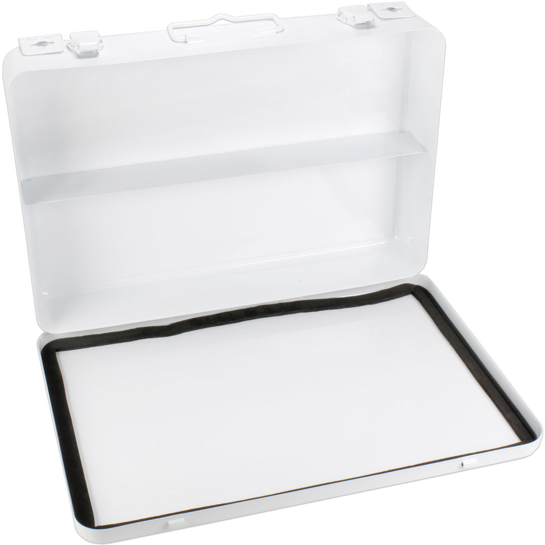 Construct a comprehensive and robust first aid or emergency kit with this 36-Unit Empty Metal Case. Designed for horizontal configuration, this durable metal case features a single shelf, sturdy hinges, and a protective gasket to help safeguard contents from dust and moisture. Its rugged construction makes it an excellent choice for demanding environments.