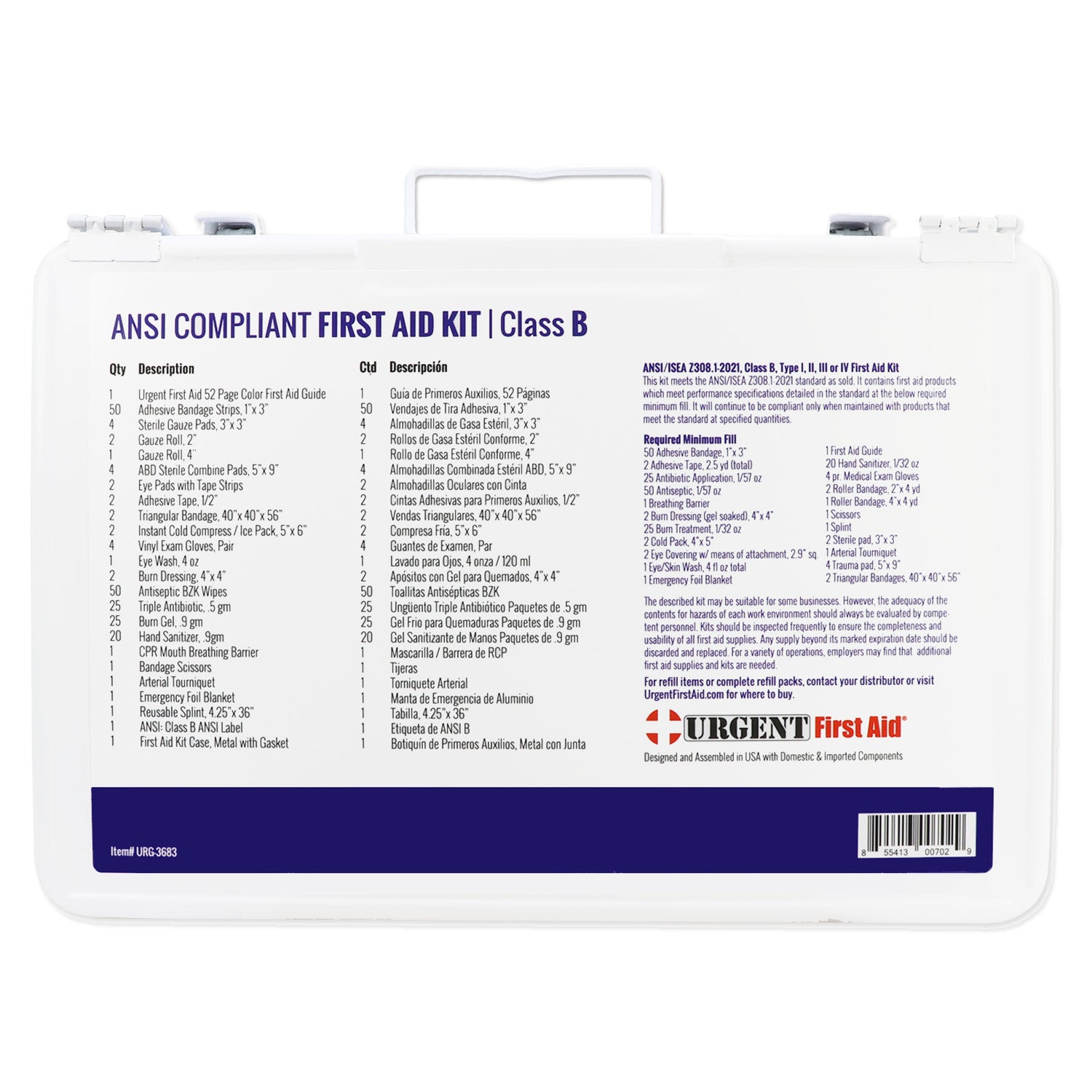 Worried about ANSI and OSHA requirements? If you have anything more than a simple office environment, you should have a "Class B" first aid kit - this Assembled in the USA first aid kit is the best value metal ANSI B First Aid kit, designed with a broader range and quantity of supplies to deal with injuries in more complex or high-risk environments. This kit meets or exceeds OSHA and ANSI 2021 Standard fill requirements, so you know you and your employees will be covered with the new ANSI 2021 requirements. This ANSI First Aid Kit includes the assortment and quantity of first aid supplies intended to deal with most types of injuries and sudden illnesses encountered in the workplace including: major wounds, minor wounds (cuts and abrasions), minor burns, sprains and strains, and eye injuries. The Urgent First Aid ANSI B kit is great for workplaces ranging from offices to production facilities and warehouses of up to 50 people, and is easily wall mounted, or removed to be taken to the accident scene. Want to learn more about ANSI & OSHA First Aid Requirements? Read our helpful information about ANSI Z308.1-2021.