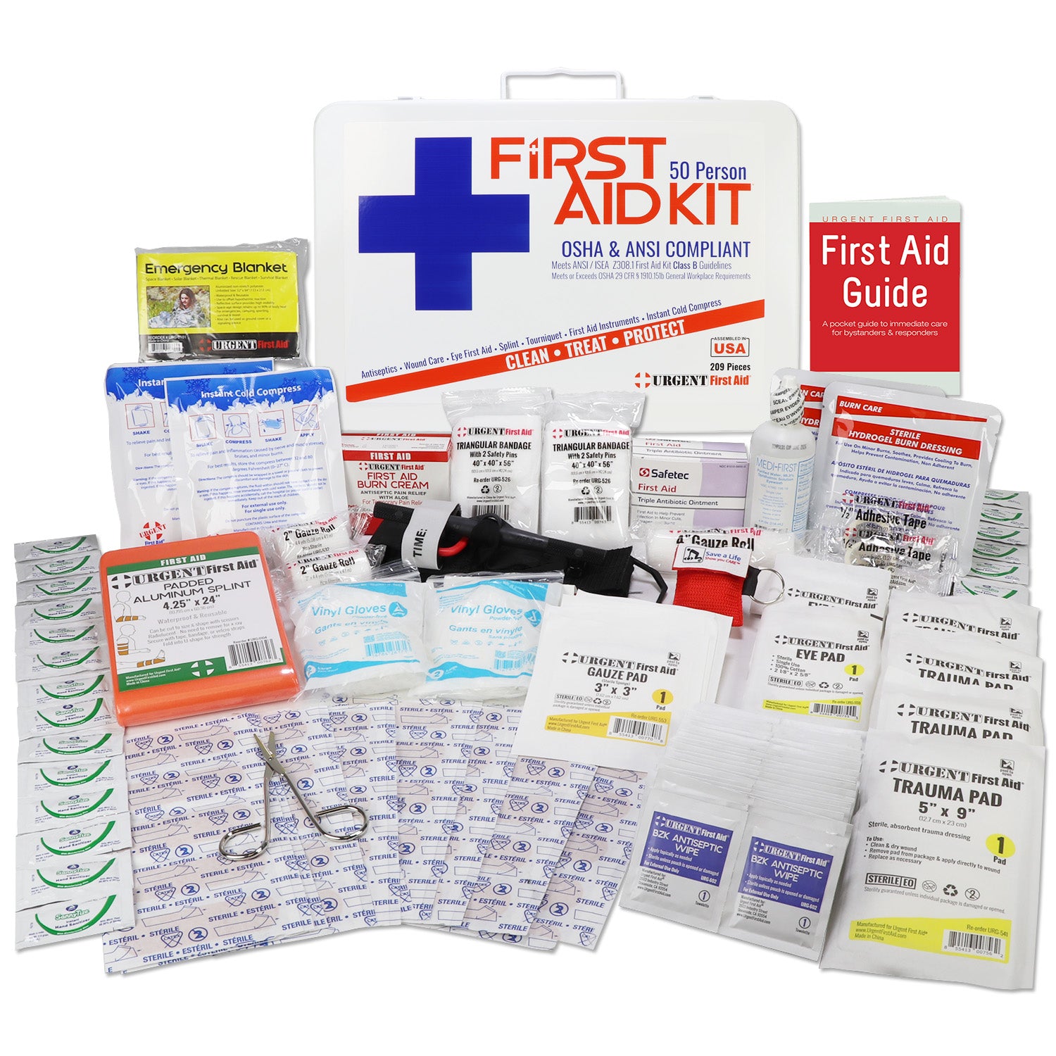 Urgent First Aid Kit, 209 Pieces, ANSI Class B, 25 to 50 Person in a sturdy, gasketed and steel case that is both portable and wall mountable. Meets requirements for ANSI case types I, II, III.
