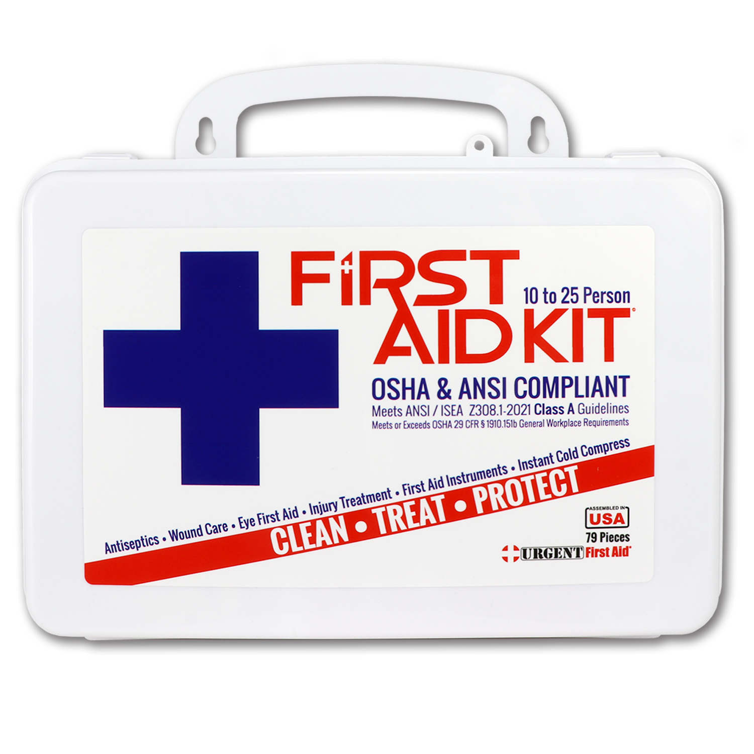 Worried about ANSI and OSHA requirements? This is our most affordable complete ANSI/OSHA first aid kit! Made right here in the USA, this Urgent First Aid kit is our best value plastic ANSI Class A first aid kit. It meets or exceeds the most recent OSHA and ANSI 2021 Standard fill requirements, with contents designed to deal with most common types of workplace injuries so you know you and your employees will be covered with the new ANSI 2021 requirements. Under the new ANSI Standard Minimum Requirements for Workplace First Aid Kits and Supplies guidelines, general requirements include the following items: Adhesive bandages, adhesive tape, antibiotic application, antiseptic, a breathing barrier, burn dressing (gel soaked), burn treatment, cold packs, eye covering, eye/skin wash, first aid guide, hand sanitizer, medical exam gloves, roller bandages, scissors, sterile pads, trauma pads, and triangular bandages. In addition the location of the kit must be easily accessible. This ANSI Class A first aid kit is great for small offices and general workplaces of up to 25 people, it is easily wall mounted, and can also be quickly removed to be taken to the accident scene. If you are not sure if you should have this Class A or a more robust Class B ANSI First Aid Kit, Read our helpful information about ANSI Z308.1-2021.